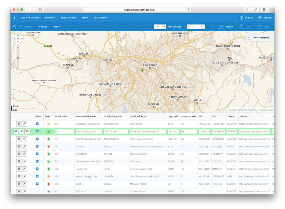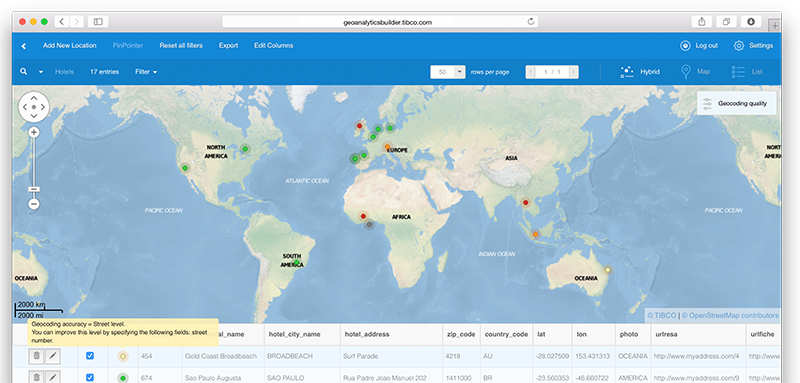 At any moment you can get information about records geocoding quality from the list view. Mouse hover a marker and a tooltip informs you about the geocoding level how to improve it.