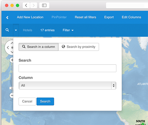 Find all objects containing a specific word or character. This mode will search through all your data columns. This is the default search mode. To do a quick search, click the magnifying glass and start typing.