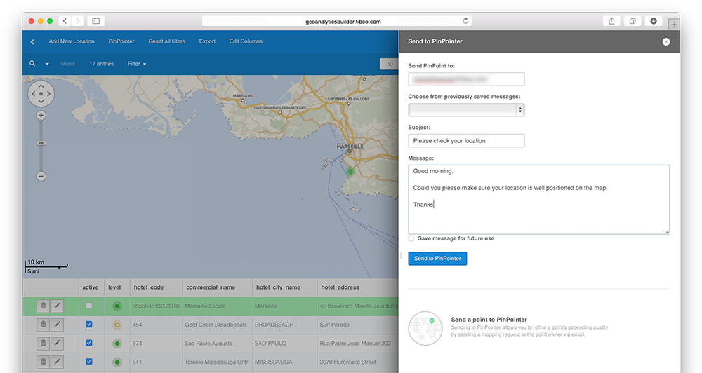 PinPointer feature helps you refine the quality of your geocodes by delegating the task of positioning addresses to addresses owners. Using this feature, owners receive an email asking them to verify a geographic position and provide improved geographic information and position for a given address.